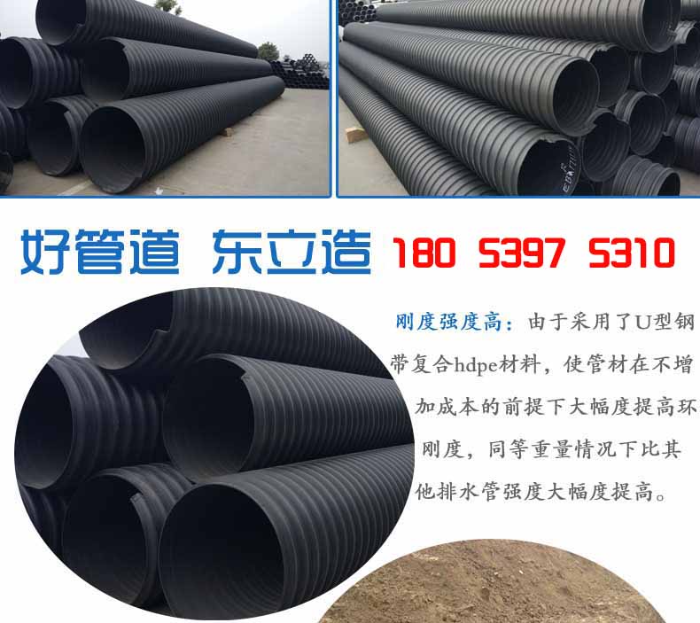 2.大口徑高強(qiáng)度:由于采用了U型鋼帶復(fù)合PE材料,使管材在不增加成本的前提下大幅度提高環(huán)剛度,同等重量情況下比其他塑料排水管強(qiáng)度大幅度提高??山鉀Q重載等一系列問題,大口徑管材優(yōu)勢(shì)更加明顯,比水泥管和其它塑料管重量更輕、強(qiáng)度更高。